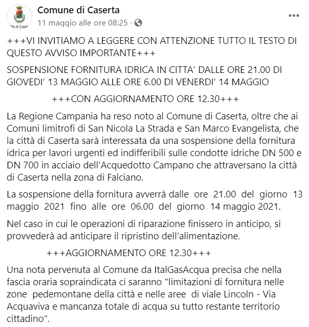 Questo quanto comunicato dal Comune di Caserta: "VI INVITIAMO A LEGGERE CON ATTENZIONE TUTTO IL TESTO DI QUESTO AVVISO IMPORTANTE SOSPENSIONE FORNITURA IDRICA IN CITTA' DALLE ORE 21.00 DI GIOVEDI' 13 MAGGIO ALLE ORE 6.00 DI VENERDI' 14 MAGGIO CON AGGIORNAMENTO ORE 12.30 La Regione Campania ha reso noto al Comune di Caserta, oltre che ai Comuni limitrofi di San Nicola La Strada e San Marco Evangelista - si legge nella nota -, che la città di Caserta sarà interessata da una sospensione della fornitura idrica per lavori urgenti ed indifferibili sulle condotte idriche DN 500 e DN 700 in acciaio dell'Acquedotto Campano che attraversano la città di Caserta nella zona di Falciano. La sospensione della fornitura avverrà dalle ore 21.00 del giorno 13 maggio 2021 fino alle ore 06.00 del giorno 14 maggio 2021. Nel caso in cui le operazioni di riparazione finissero in anticipo, si provvederà ad anticipare il ripristino dell’alimentazione. AGGIORNAMENTO ORE 12.30 Una nota pervenuta al Comune da ItalGasAcqua precisa che nella fascia oraria sopraindicata - si legge nella nota - ci saranno "limitazioni di fornitura nelle zone pedemontane della città e nelle aree di viale Lincoln - Via Acquaviva e mancanza totale di acqua su tutto restante territorio cittadino"."