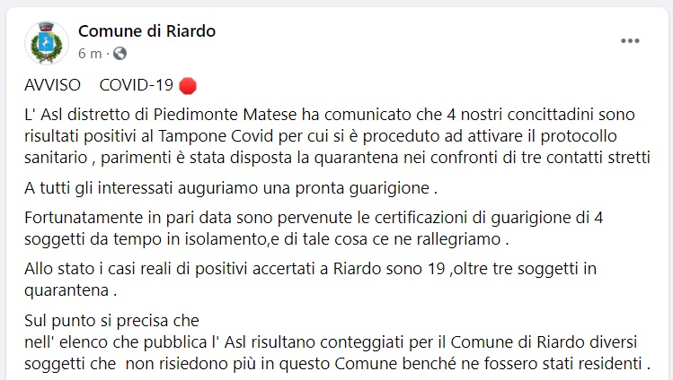 Questo quanto pubblicato sulla pagina fb del Comune di Riardo