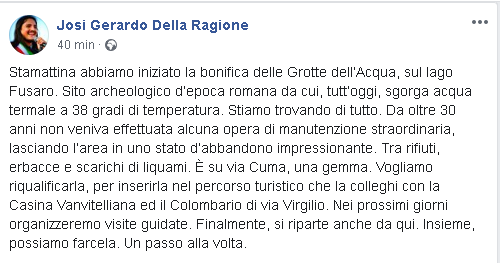 "Stamattina abbiamo iniziato la bonifica delle Grotte dell’Acqua, sul lago Fusaro. Sito archeologico d’epoca romana da cui, tutt’oggi, sgorga acqua termale a 38 gradi di temperatura. Stiamo trovando di tutto. Da oltre 30 anni non veniva effettuata alcuna opera di manutenzione straordinaria, lasciando l’area in uno stato d’abbandono impressionante. Tra rifiuti, erbacce e scarichi di liquami. È su via Cuma, una gemma. Vogliamo riqualificarla, per inserirla nel percorso turistico che la colleghi con la Casina Vanvitelliana ed il Colombario di via Virgilio. Nei prossimi giorni organizzeremo visite guidate. Finalmente, si riparte anche da qui. Insieme, possiamo farcela. Un passo alla volta."