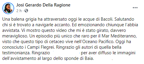 Questo parte del post pubblicato sulla sua pagina Facebook dal Sindaco di Bacoli Josi Gerado Della Ragione: "Una balena grigia ha attraversato oggi le acque di Bacoli. Salutando chi si è trovato a navigarle accanto. Ed emozionando chiunque l’abbia avvistata. Vi mostro questo video che mi è stato girato, davvero meraviglioso. Un episodio - si legge nel post - più unico che raro per il Mar Mediteranno, visto che questo tipo di cetaceo vive nell’Oceano Pacifico. Oggi ha conosciuto i Campi Flegrei. Ringrazio gli autori di quella bella testimonianza. Ringrazio - prosegue il post - (...) per aver diffuso le immagini dell’avvistamento al largo dello sponde di Baia. (...)".
