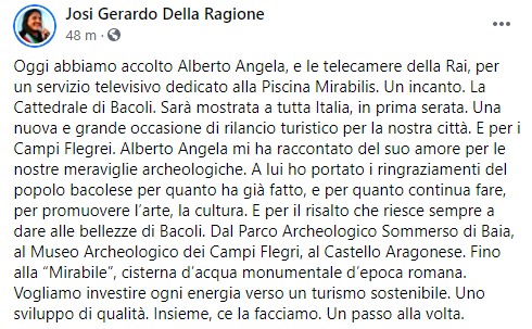 Questo il post pubblicato sulla sua pagina Facebook dal Sindaco di Bacoli Josi Gerardo Della Ragione: "Oggi abbiamo accolto Alberto Angela, e le telecamere della Rai, per un servizio televisivo dedicato alla Piscina Mirabilis. Un incanto. La Cattedrale di Bacoli. Sarà mostrata a tutta Italia, in prima serata. Una nuova e grande occasione di rilancio turistico - si legge nel post - per la nostra città. E per i Campi Flegrei. Alberto Angela mi ha raccontato del suo amore per le nostre meraviglie archeologiche. A lui ho portato i ringraziamenti del popolo bacolese per quanto ha già fatto, e per quanto continua fare, per promuovere l’arte, la cultura. E per il risalto che riesce sempre a dare alle bellezze di Bacoli. Dal Parco Archeologico Sommerso di Baia - si legge ancora - al Museo Archeologico dei Campi Flegrei, al Castello Aragonese. Fino alla “Mirabile”, cisterna d’acqua monumentale d’epoca romana. Vogliamo investire ogni energia verso un turismo sostenibile. Uno sviluppo di qualità. Insieme, ce la facciamo. Un passo alla volta".