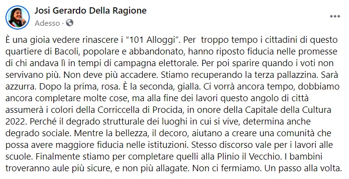 "È una gioia vedere rinascere i “101 Alloggi”. Per troppo tempo i cittadini di questo quartiere di Bacoli, popolare e abbandonato, hanno riposto fiducia nelle promesse di chi andava lì in tempi di campagna elettorale. Per poi sparire quando i voti non servivano più. Non deve più accadere. Stiamo recuperando- si legge nella nota- la terza pallazzina. Sarà azzurra. Dopo la prima, rosa. È la seconda, gialla. Ci vorrà ancora tempo, dobbiamo ancora completare molte cose, ma alla fine dei lavori questo angolo di città assumerà i colori della Corriccella di Procida, in onore della Capitale della Cultura 2022. Perché il degrado strutturale dei luoghi in cui si vive, determina anche degrado sociale. Mentre la bellezza, il decoro, aiutano a creare una comunità che possa avere maggiore fiducia nelle istituzioni. Stesso discorso- si legge nella nota- vale per i lavori alle scuole. Finalmente stiamo per completare quelli alla Plinio il Vecchio. I bambini troveranno aule più sicure, e non più allagate. Non ci fermiamo. Un passo alla volta."