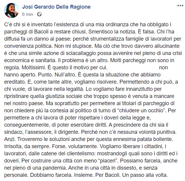 Questo parte di quanto apprendiamo dalla pagina facebook del Sindaco Della Ragione: