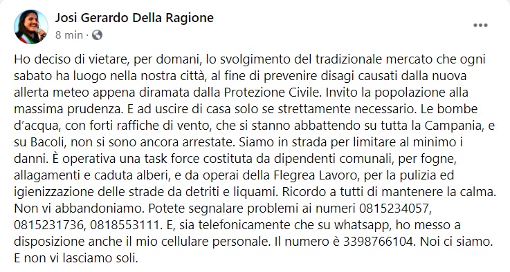 Questo quanto pubblicato sulla pagina facebook del Sindaco Della Ragione: