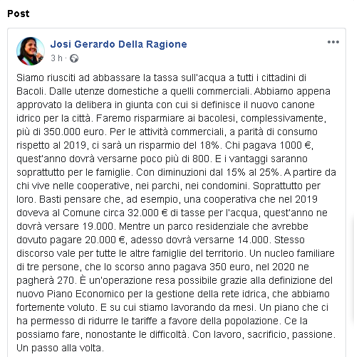 "Siamo riusciti ad abbassare la tassa sull’acqua a tutti i cittadini di Bacoli. Dalle utenze domestiche a quelli commerciali. Abbiamo appena approvato la delibera in giunta con cui si definisce il nuovo canone idrico per la città. Faremo risparmiare ai bacolesi, complessivamente, più di 350.000 euro. Per le attività commerciali, a parità di consumo rispetto al 2019, ci sarà un risparmio del 18%. Chi pagava 1000 €, quest’anno dovrà versarne poco più di 800. E i vantaggi saranno soprattutto per le famiglie. Con diminuzioni dal 15% al 25%. A partire da chi vive nelle cooperative, nei parchi, nei condomini. Soprattutto per loro. Basti pensare che, ad esempio, una cooperativa che nel 2019 doveva al Comune circa 32.000 € di tasse per l’acqua, quest’anno ne dovrà versare 19.000. Mentre un parco residenziale che avrebbe dovuto pagare 20.000 €, adesso dovrà versarne 14.000. Stesso discorso vale per tutte le altre famiglie del territorio. Un nucleo familiare di tre persone, che lo scorso anno pagava 350 euro, nel 2020 ne pagherà 270. È un’operazione resa possibile grazie alla definizione del nuovo Piano Economico per la gestione della rete idrica, che abbiamo fortemente voluto. E su cui stiamo lavorando da mesi. Un piano che ci ha permesso di ridurre le tariffe a favore della popolazione. Ce la possiamo fare, nonostante le difficoltà. Con lavoro, sacrificio, passione. Un passo alla volta."