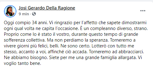 Questo il post pubblicato dal Sindaco di Bacoli Josi Gerardo Della Ragione sulla sua pagina Facebook: "Oggi compio 34 anni. Vi ringrazio per l’affetto che sapete dimostrarmi ogni qual volta ne capita l’occasione. È un compleanno diverso, strano. Proprio come lo è stato - continua il post - il vostro, durante questo tempo di grande sofferenza collettiva. Ma non perdiamo la speranza. Torneremo a vivere giorni più felici, belli. Ne sono certo. Lotterò con tutto me stesso, accanto a voi, affinché ciò accada. Torneremo ad abbracciarci. Ne abbiamo bisogno. Siete per me una grande famiglia allargata - conclude il post - Vi voglio tanto bene". Auguri di buon compleanno al Sindaco anche dalla redazione di Goldwebtv