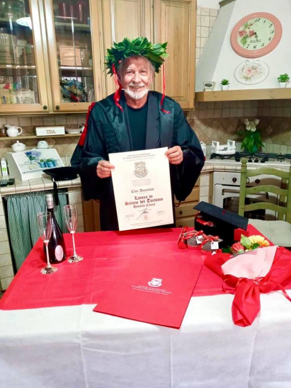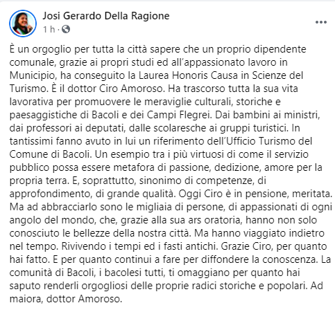 Questo il post pubblicato dal Sindaco di Bacoli Josi Gerardo Della Ragione sulla sua pagina Facebook: "È un orgoglio per tutta la città sapere che un proprio dipendente comunale, grazie ai propri studi ed all’appassionato lavoro in Municipio, ha conseguito la Laurea Honoris Causa in Scienze del Turismo. È il dottor Ciro Amoroso. Ha trascorso - si legge nel post - tutta la sua vita lavorativa per promuovere le meraviglie culturali, storiche e paesaggistiche di Bacoli e dei Campi Flegrei. Dai bambini ai ministri, dai professori ai deputati, dalle scolaresche ai gruppi turistici. In tantissimi fanno avuto in lui un riferimento dell’Ufficio Turismo del Comune di Bacoli. Un esempio tra i più virtuosi di come il servizio pubblico possa essere metafora di passione, dedizione, amore per la propria terra. E, soprattutto, sinonimo di competenze, di approfondimento, di grande qualità. Oggi Ciro - prosegue il post - è in pensione, meritata. Ma ad abbracciarlo sono le migliaia di persone, di appassionati di ogni angolo del mondo, che, grazie alla sua ars oratoria, hanno non solo conosciuto le bellezze della nostra città. Ma hanno viaggiato indietro nel tempo. Rivivendo i tempi ed i fasti antichi. Grazie Ciro, per quanto hai fatto. E per quanto continui a fare per diffondere la conoscenza. La comunità di Bacoli, i bacolesi tutti, ti omaggiano - conclude il post - per quanto hai saputo renderli orgogliosi delle proprie radici storiche e popolari. Ad maiora, dottor Amoroso".