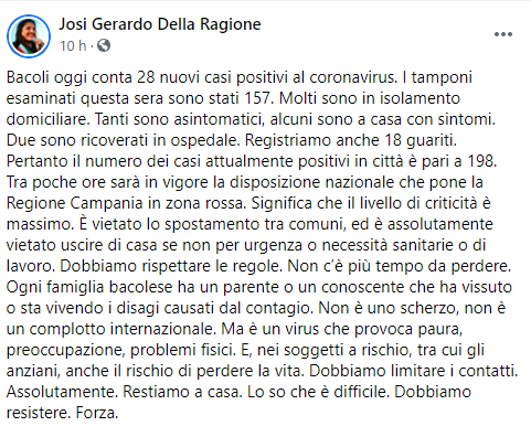 Dalla pagina Facebook del Sindaco di Bacoli Josi Gerardo Della Ragioneella Ragione