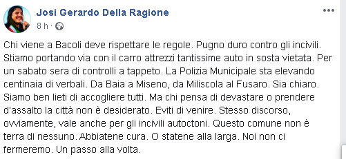 "Chi viene a Bacoli deve rispettare le regole. Pugno duro contro gli incivili. Stiamo portando via con il carro attrezzi tantissime auto in sosta vietata. Per un sabato sera di controlli a tappeto. La Polizia Municipale sta elevando centinaia di verbali. Da Baia a Miseno, da Miliscola al Fusaro. Sia chiaro. Siamo ben lieti di accogliere tutti. Ma chi pensa di devastare o prendere d’assalto la città non è desiderato. Eviti di venire. Stesso discorso, ovviamente, vale anche per gli incivili autoctoni. Questo comune non è terra di nessuno. Abbiatene cura. O statene alla larga. Noi non ci fermeremo. Un passo alla volta."