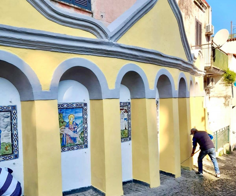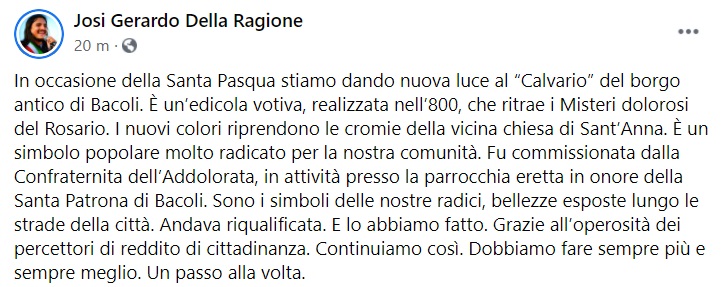 "In occasione della Santa Pasqua stiamo dando nuova luce al “Calvario” del borgo antico di Bacoli. È un’edicola votiva, realizzata nell’800, che ritrae i Misteri dolorosi del Rosario. I nuovi colori riprendono le cromie della vicina chiesa di Sant’Anna. È un simbolo popolare molto radicato per la nostra comunità. Fu commissionata- si legge nella nota- dalla Confraternita dell’Addolorata, in attività presso la parrocchia eretta in onore della Santa Patrona di Bacoli. Sono i simboli delle nostre radici, bellezze esposte lungo le strade della città. Andava riqualificata. E lo abbiamo fatto. Grazie all’operosità dei percettori di reddito di cittadinanza. Continuiamo così. Dobbiamo fare- si legge nella nota- sempre più e sempre meglio. Un passo alla volta."