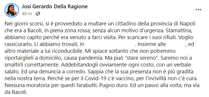 "Nei giorni scorsi, si è provveduto a multare un cittadino della provincia di Napoli che era a Bacoli, in piena zona rossa, senza alcun motivo d’urgenza. Stamattina, abbiamo capito perché era venuto a farci visita. Per scaricare i suoi rifiuti. Voglio rassicurarlo. -Si legge nella nota- Li abbiamo trovati, in ... Insieme alle ... , ed altro materiale a lui riconducibile. Mi spiace soltanto che non potremmo riportarglieli a domicilio, causa pandemia. Ma può “stare sereno”. Saremo noi a smaltirli correttamente. Addebitandogli ovviamente ogni costo, con un verbale salato. -Si legge nella nota- Ed una denuncia a corredo. Sappia che la sua presenza non è più gradita nella nostra terra. Perché se per il Covid-19 c’è vaccino, per l’inciviltà non c’è cura. Nessuna moratoria per questi farabutti. Pugno duro. Ed un passo alla volta, ma via da Bacoli."
