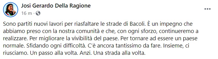"Sono partiti nuovi lavori per riasfaltare le strade di Bacoli. È un impegno che abbiamo preso con la nostra comunità e che, con ogni sforzo, continueremo a realizzare. Per migliorare la vivibilità del paese. Per tornare ad essere un paese normale. Sfidando- si legge nella nota- ogni difficoltà. C’è ancora tantissimo da fare. Insieme, ci riusciamo. Un passo alla volta. Anzi. Una strada alla volta."