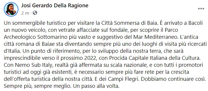 "Un sommergibile turistico per visitare la Città Sommersa di Baia. È arrivato a Bacoli un nuovo veicolo, con vetrate affacciate sul fondale, per scoprire il Parco Archeologico Sottomarino più vasto e suggestivo- si legge nella nota- del Mar Mediterraneo. L’antica città romana di Baiae sta diventando sempre più uno dei luoghi di visita più ricercati d’Italia. Un punto di riferimento, per lo sviluppo della nostra terra, che sarà imprescindibile verso il prossimo 2022, con Procida Capitale Italiana della Cultura. Con Nemo Sub Italy, realtà già affermata su scala nazionale, e con tutti i promotori turistici ad oggi già esistenti, è necessario- si legge nella nota- sempre più fare rete per la crescita dell’offerta turistica della nostra città. E dei Campi Flegri. Dobbiamo continuare così. Sempre più, sempre meglio. Un passo alla volta."