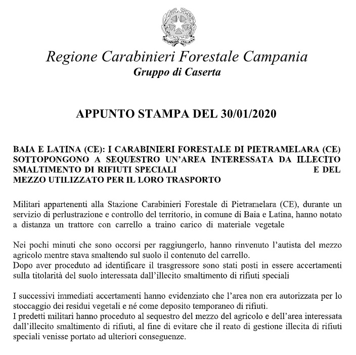 Pubblichiamo parte della nota stampa del Comando Provinciale Carabinieri di Caserta