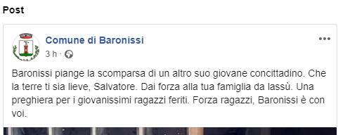 "Baronissi piange la scomparsa di un altro suo giovane concittadino. Che la terre ti sia lieve, Salvatore. Dai forza alla tua famiglia da lassù. Una preghiera per i giovanissimi ragazzi feriti. Forza ragazzi, Baronissi è con voi."