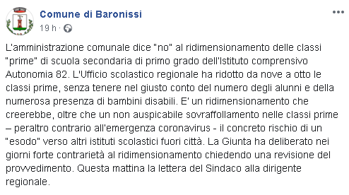 "L’amministrazione comunale dice “no” al ridimensionamento delle classi “prime” di scuola secondaria di primo grado dell’Istituto comprensivo Autonomia 82. L'Ufficio scolastico regionale ha ridotto da nove a otto le classi prime, senza tenere nel giusto conto del numero degli alunni e della numerosa presenza di%u200B bambini disabili. E’ un ridimensionamento che creerebbe, oltre che un non auspicabile sovraffollamento nelle classi prime – peraltro contrario all’emergenza coronavirus -%u200B il concreto rischio di un “esodo” verso altri istituti scolastici fuori città. La Giunta ha deliberato nei giorni forte contrarietà al ridimensionamento chiedendo una revisione del provvedimento. Questa mattina la lettera del Sindaco alla dirigente regionale."