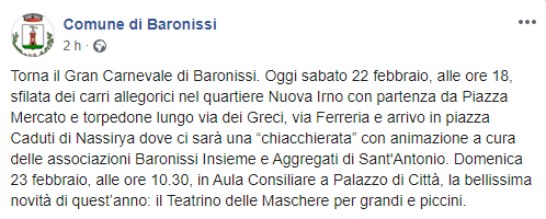 "Torna il Gran Carnevale di Baronissi. Oggi sabato 22 febbraio, alle ore 18, sfilata dei carri allegorici nel quartiere Nuova Irno con partenza da Piazza Mercato e torpedone lungo via dei Greci, via Ferreria e arrivo in piazza Caduti di Nassirya dove ci sarà una “chiacchierata” con animazione a cura delle associazioni Baronissi Insieme e Aggregati di Sant'Antonio. Domenica 23 febbraio, alle ore 10.30, in Aula Consiliare a Palazzo di Città, la bellissima novità di quest’anno: il Teatrino delle Maschere per grandi e piccini."