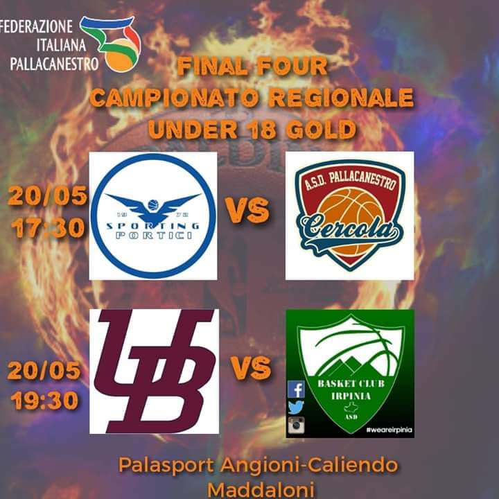 Da domani lunedì 20 maggio al Palasport Angioni Caliendo di Maddaloni si disputerà la Final Four che assegnerà il titolo del campionato regionale Under 18 Gold. Oltre alla formazione locale dell'Uniobasket parteciperanno anche Basket Club Irpinia, Pallacanestro Cercola e Sporting Portici. Gare al via dalle ore 17:30.