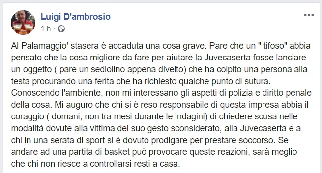 Questo quanto scritto dall'allenatore e Delegato provinciale di Caserta del CNA (Comitato Nazionale Allenatori) Luigi D'Ambrosio, in merito a questo increscioso episodio.