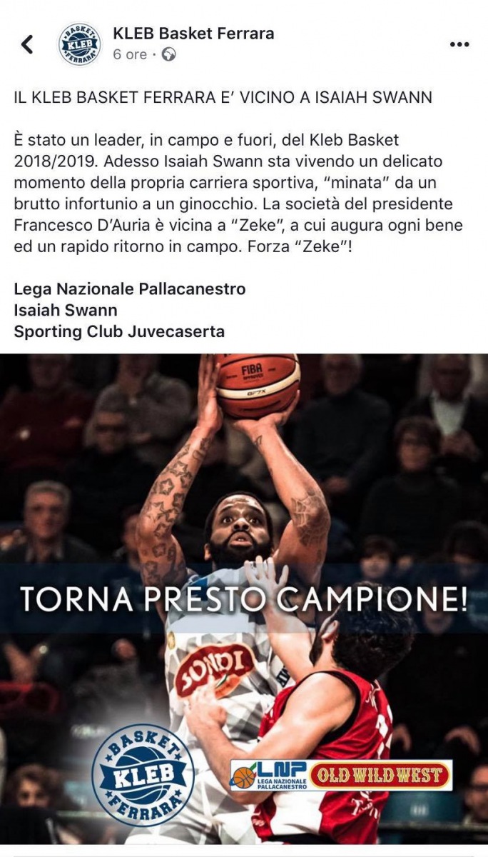 Questo quanto pubblicato dal Kleb Basket Ferrara in merito all'infortunio di Isaiah Swann