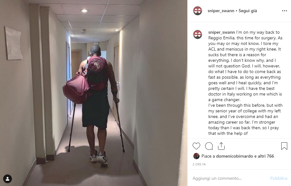 Isaiah Swann ha postato sul proprio profilo Instagram un lungo messaggio. Questo è parte del post: "Sto tornando a Reggio Emilia, questa volta per un intervento chirurgico... Farò tutto il necessario per tornare il più velocemente possibile, per guarire rapidamente... prego che con l'aiuto della società possiamo affrontare il recupero un passo alla volta, in modo da poter tornare ad aiutare la squadra! So anche che mia moglie, i miei figli, la mia famiglia e i miei amici mi aiuteranno nel mio viaggio."