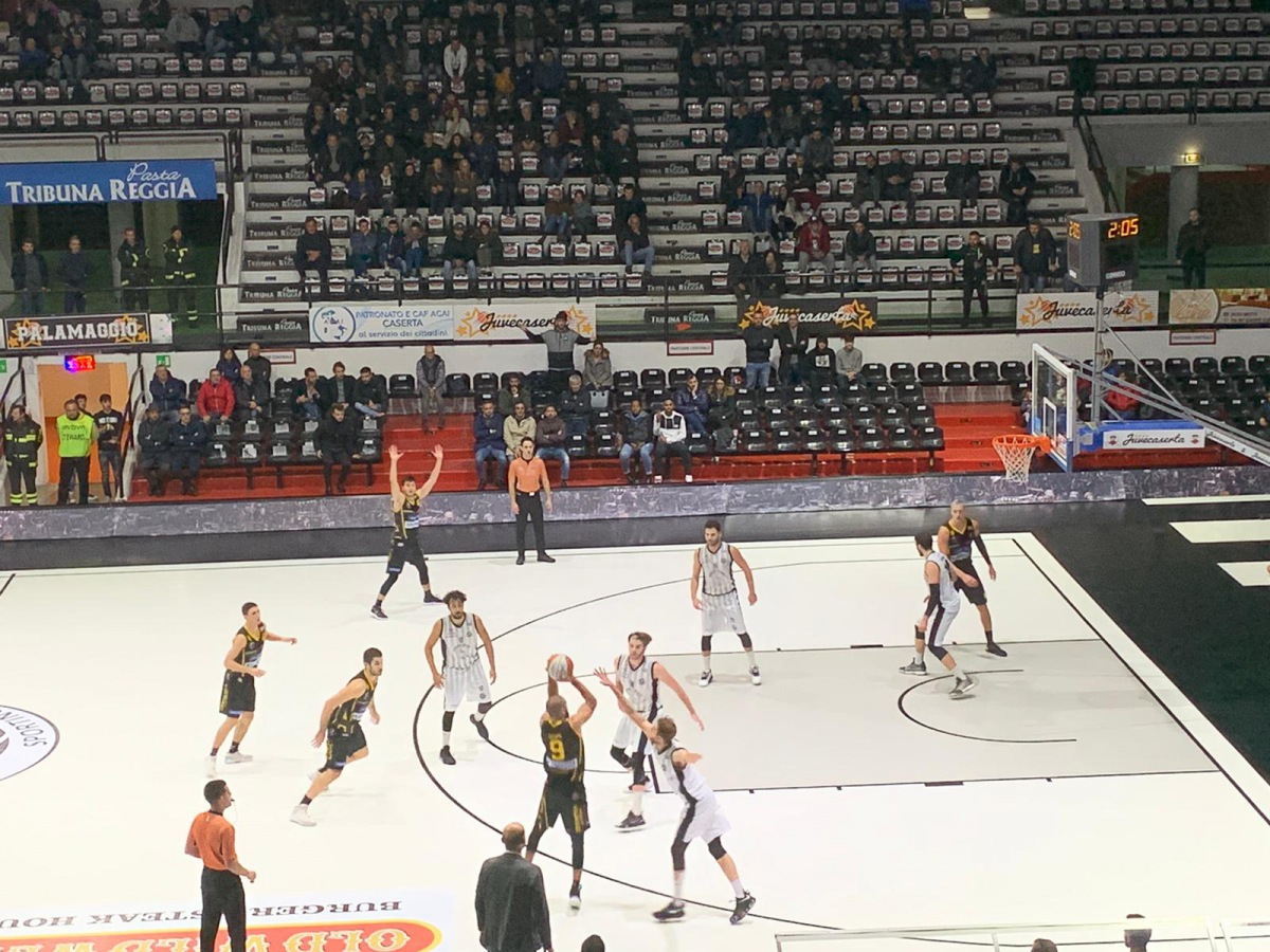 Il secondo periodo della gara vede Caserta iniziare con un parziale di 5-0 così da raggiungere la doppia cifra di vantaggio (30-20). San Severo è però squadra caparbia, e grazie ai tiri da 3 riesce a rimanere aggrappata nel punteggio. Addirittura ricuce sino al -4, ed è solo capitan Giuri con 7 punti consecutivi a tenere Caserta avanti. Negli ultimi minuti il tifo bianconero si fa ancora più rumoroso quando alcuni fischi penalizzano oltremodo i padroni di casa, che fortunatamente non vengono puniti dalla lunetta. Le ultime due azioni sono fatali a Caserta che prima, su una decisione ancora dubbia che fa inviperire coach Gentile si vede recapitare un fallo tecnico; poi sulla sirena Demps mette a segno la tripla del 42 pari con il quale si va al riposo lungo.