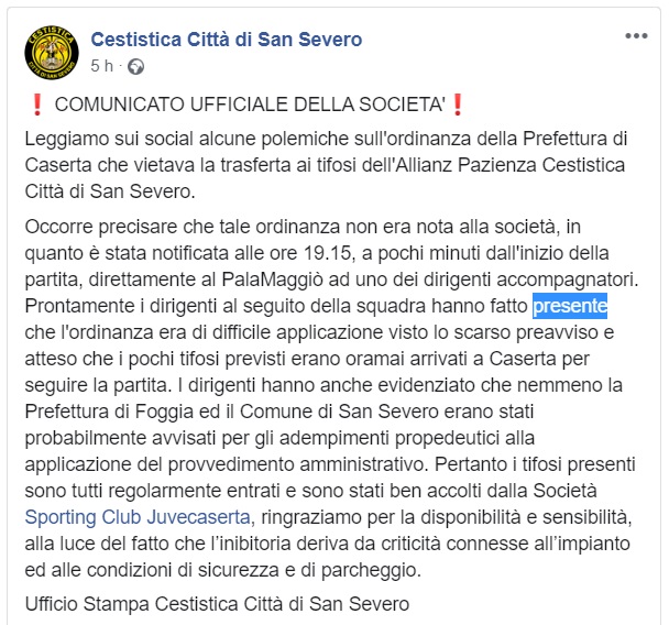 Questo quanto pubblicato dalla Cestistica San Severo sulla propria pagina FB