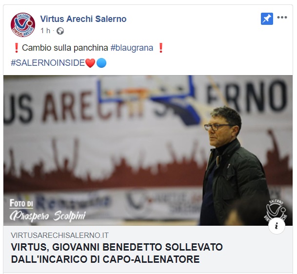 La Virtus Arechi Salerno ha sollevato dall'incarico di capo allenatore Giovanni Benedetto, nonostante un record di 17 vittorie e 4 sconfitte nel campionato di Serie B. Per la prossima gara di domenica, il derby con Pozzuoli, a guidare i salernitani dalla panchina sarà Adolfo Parrillo, già assistente di Benedetto ed ex giocatore e allenatore tra le altre di San Michele Maddaloni e Cedri San Nicola. E non è detto che la scelta della società non possa essere quella di continuare proprio con lui nell'incarico di coach fino alla fine della stagione. Questo quanto apprendiamo dalla pagina FB della Virtus Arechi Salerno