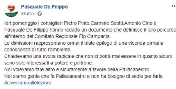 Questo il post pubblicato su fb dal Cons. Reg. Fip Pasquale De Filippo.
