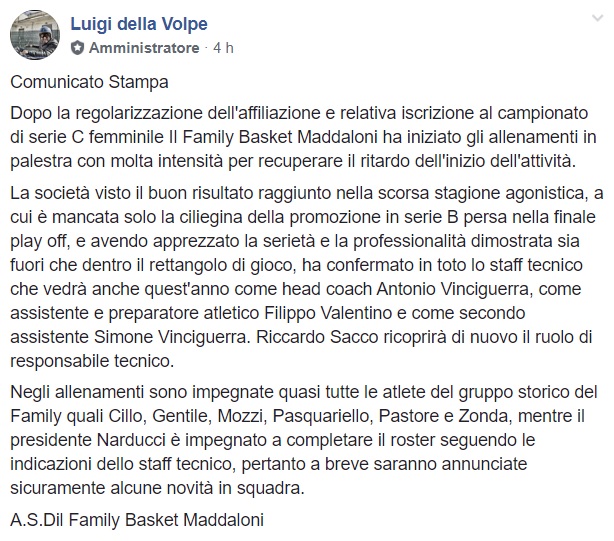 Questa la nota stampa del Family Basket: