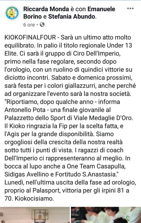La formazione Under 13 del Kioko Caserta si gioca questo pomeriggio (ore 19:30) tra le mura di casa del palazzetto Pinto il titolo regionale, dopo aver battuto la Sidigas Avellino nella giornata di ieri. In finale affronterà i cugini del One Team Casapulla in una sfida tutta casertana.