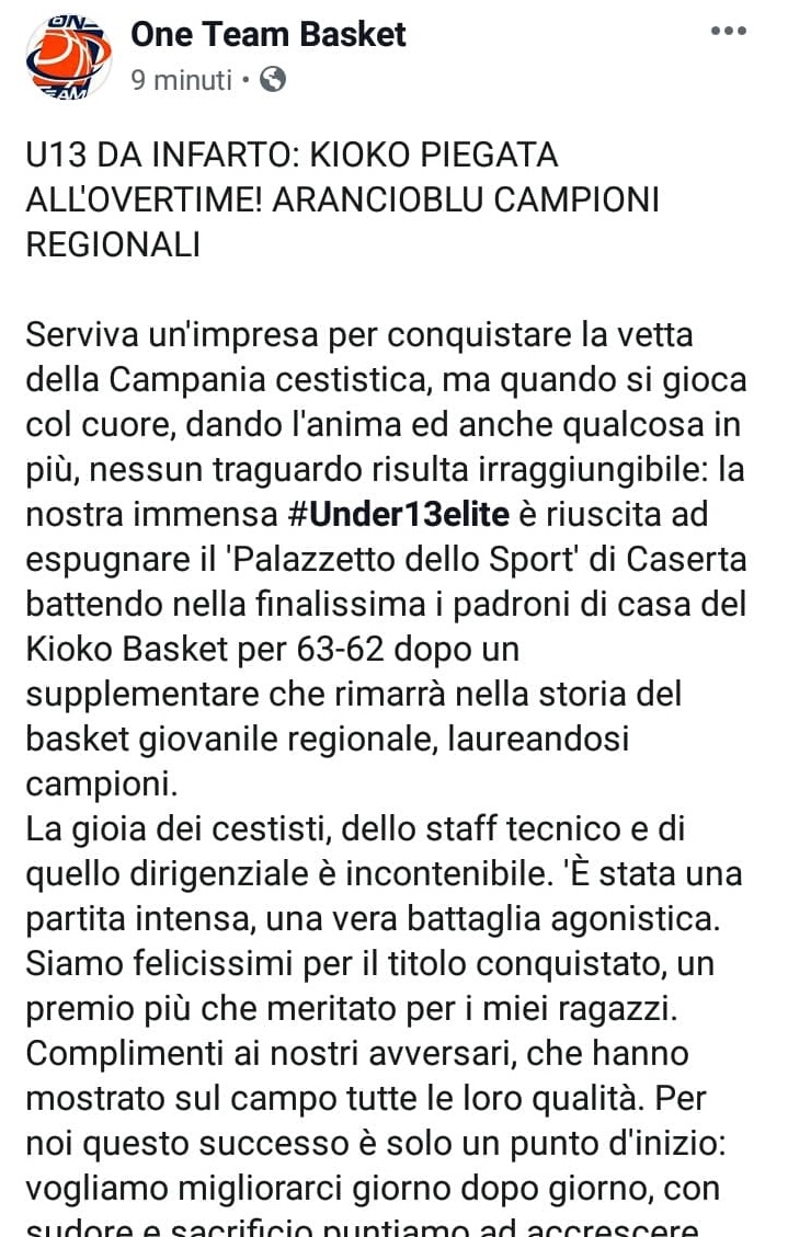 Al Palazeto di viale Medaglie d'Oro è andata in scena la finale tutta casertana del campionato Under 13 regionale tra il Kioko Caserta ed il One Team Casapulla.