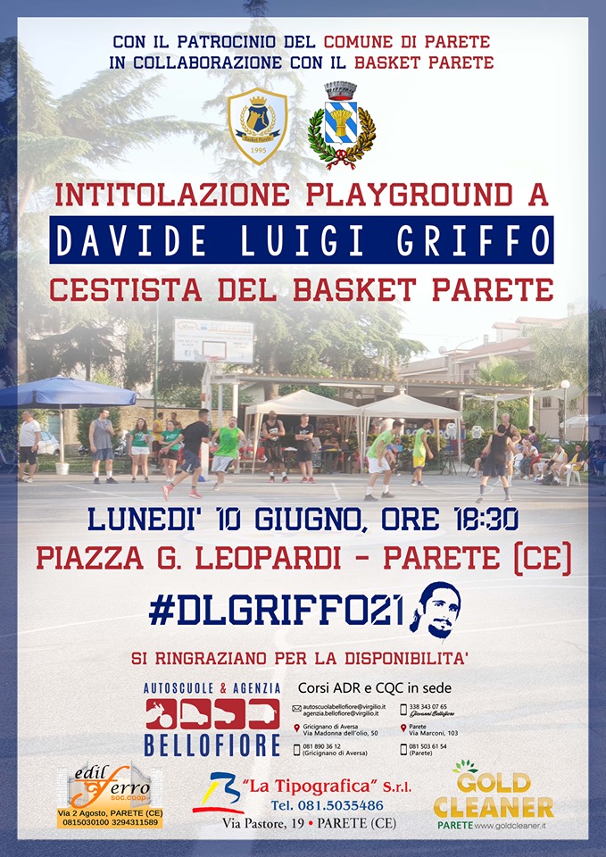"Lunedì 10 Giugno, ore 18:30, presso la Piazza Giacomo Leopardi - Parete (CE). Sul campo, dalle ore 17:00, verranno distribuite le magliette in ricordo di Davide. E' possibile richiederle anche nei giorni precedenti l'evento, contattando la Polisportiva Basket Parete. Grazie all'amministrazione comunale, alla famiglia Griffo Franco che gestisce la piazza per la grande disponibilità. Si ringrazia di cuore Latipografica1 SRL per la stampa delle maglie. Si ringraziano per la disponibilità Pietro Gold GoldCleaner ed Edil Ferro Maione Edilfero Società cooperativa. Si ringrazia, infine, l'autoscuola Autoscuola Agenzia Bellofiore per aver messo a disposizione i nuovi tabelloni da basket. TUTTI SONO INVITATI A PARTECIPARE! "Davide è stato un fratello, un amico, un compagno di squadra e di mille avventure vissute assieme in questi ultimi anni; un esempio di professionalità e lealtà, sempre presente sia in campo che nello spogliatoio, sempre pronto ad incitare i compagni e sempre pronto a trasmettere quella voglia di lottare insieme; un modello da trasmettere ai più piccoli"
