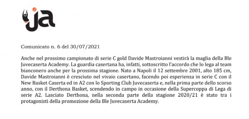 "Anche nel prossimo campionato di serie C gold Davide Mastroianni vestirà la maglia della Ble Juvecaserta Academy. La guardia casertana ha, infatti, sottoscritto l’accordo che lo lega al team bianconero anche per la prossima stagione. Nato a Napoli il 12 settembre 2001, alto 185 cm, Davide Mastroianni- si legge nella nota- è cresciuto nel vivaio casertano, facendo poi esperienza in serie C con il New Basket Caserta ed in A2 con lo Sporting Club Juvecaserta e, nella prima parte dello scorso anno, con il Derthona Basket, scendendo in campo in occasione della Supercoppa di Lega di serie A2. Lasciato Derthona, nella seconda parte della stagione 2020/21 è stato- si legge nella nota- tra i protagonisti della promozione della Ble Juvecaserta Academy."