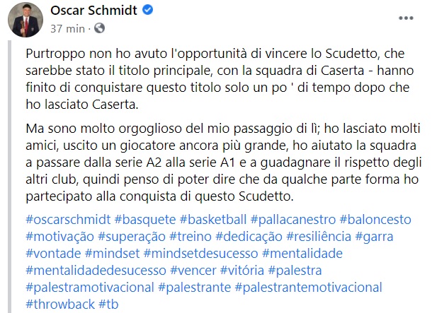 Questo quanto apprendiamo dalla pagina facebook di Oscar Schmidt:
