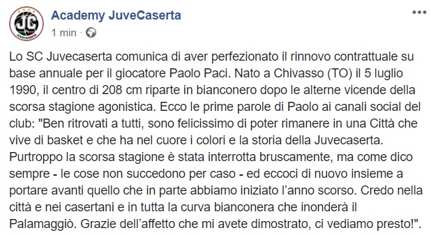 Questo quanto apprendiamo dalla pagina facebook della Juvecaserta: