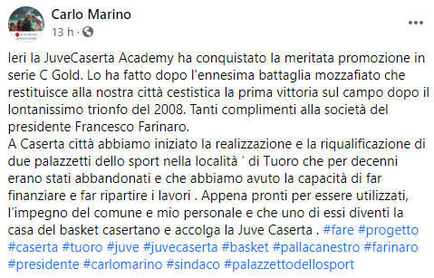 Questo il post pubblicato ieri dal Sindaco di Caserta Carlo Marino sulla sua pagina Facebook: "Ieri la JuveCaserta Academy ha conquistato la meritata promozione in serie C Gold. Lo ha fatto dopo l'ennesima battaglia mozzafiato che restituisce alla nostra città cestistica la prima vittoria sul campo dopo il lontanissimo trionfo del 2008. Tanti complimenti - si legge nl post - alla società del presidente Francesco Farinaro. A Caserta città abbiamo iniziato la realizzazione e la riqualificazione di due palazzetti dello sport nella località ‘ di Tuoro che per decenni erano stati abbandonati e che abbiamo avuto la capacità - prosegue il post - di far finanziare e far ripartire i lavori . Appena pronti per essere utilizzati, l’impegno del comune e mio personale e che uno di essi diventi la casa del basket casertano e accolga la Juve Caserta".