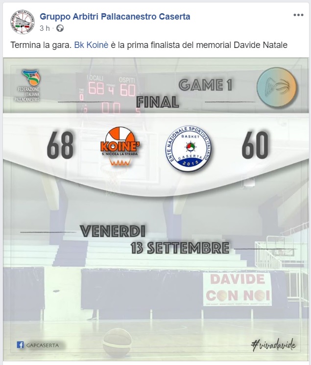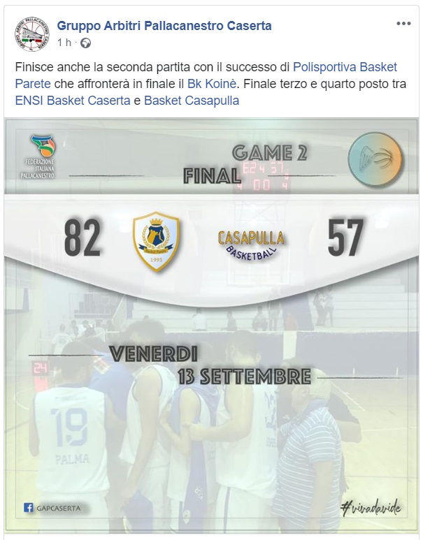 Questo quanto pubblicato sulla pagina FB Gruppo Arbitri di Caserta. La finale si disputerà domenica alle ore 20:00 al palazzetto di Viale Medaglie d'Oro.