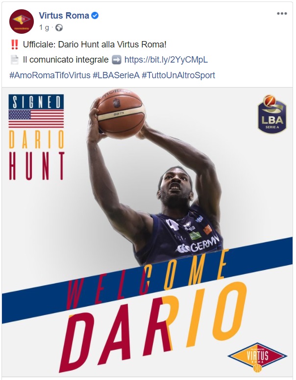 Questo quanto pubblicato dalla sua nuova società, la Virtus Roma che ha ufficializzato l'ingaggio dell'ex pivot della Juvecaserta Dario Hunt