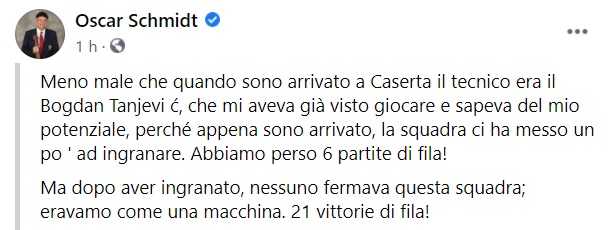 Questo quanto pubblicato sulla pagina fb di Oscar: "Meno male che quando sono arrivato a Caserta il tecnico era Bogdan Tanjevic, che mi aveva già visto giocare e sapeva del mio potenziale, perché appena sono arrivato - si legge nella nota -, la squadra ci ha messo un po' ad ingranare. Abbiamo perso 6 partite di fila! Ma dopo aver ingranato, nessuno fermava questa squadra; eravamo come una macchina. 21 vittorie di fila!"