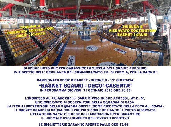 "Basket - si legge nel post - Scauri - Decò Caserta, ecco le disposizioni per i tifosi locali - conclude il post - ed ospiti..."