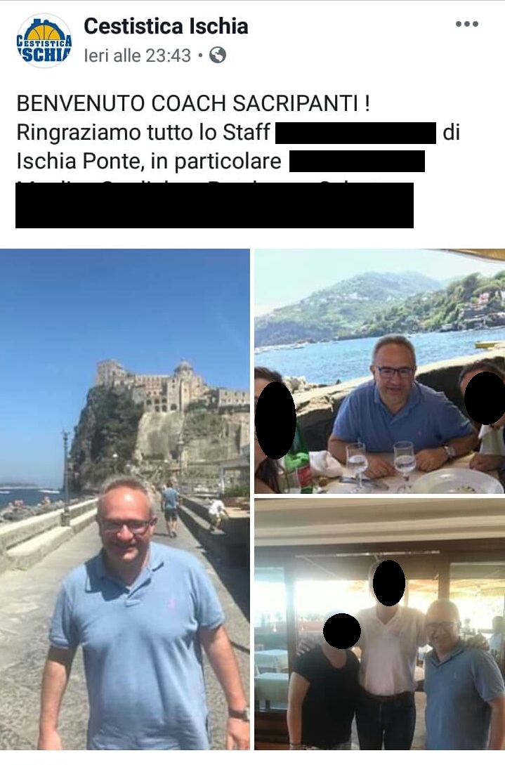 Ha lasciato un ottimo ricordo nella sua esperienza alla Juvecaserta, ed è particolarmente affezzionato alla città ed alla Campania in generale, visto che poi vi è ritornato anche per lavoro (sponda Avellino in quel caso). Da ieri coach Pino Sacripanti soggiorna ad Ischia, dove è stato accolto con grande affetto.
