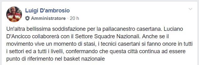 Caserta è città di pallacanestro, e lo dimostra il fatto che tanti casertani vengono chiamati per ricoprire ruoli importanti a livello nazionale. E' il caso di Luciano D'Ancicco, preparatore atletico della Leonessa Brescia in serie A che adesso collaborerà con il Settore Squadre Nazionali. A comunicare la notizia l'ex responsabile del CNA di Caserta Luigi D'Ambrosio.