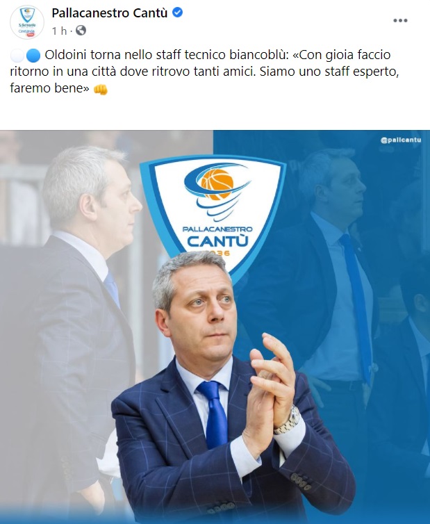 Questo quanto apprendiamo dalla pagina facebook della Pallacanestro Cantù: "Oldoini torna nello staff tecnico biancoblù: «Con gioia faccio ritorno in una città dove ritrovo tanti amici. Siamo uno staff esperto, faremo bene»"