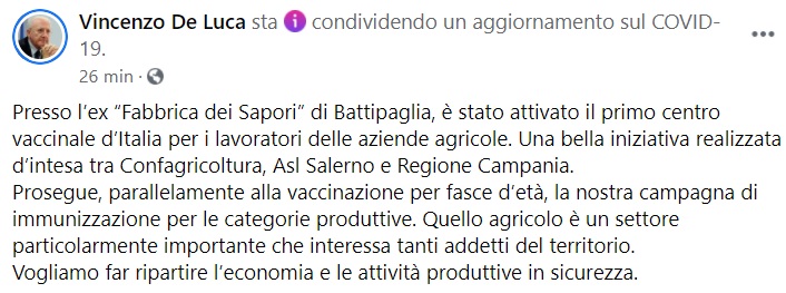 "Presso l’ex “Fabbrica dei Sapori” di Battipaglia, è stato attivato il primo centro vaccinale d’Italia per i lavoratori delle aziende agricole. Una bella iniziativa realizzata d’intesa tra Confagricoltura, Asl Salerno e Regione Campania. Prosegue, parallelamente alla vaccinazione per fasce d’età, la nostra campagna di immunizzazione- si legge nella nota- per le categorie produttive. Quello agricolo è un settore particolarmente importante che interessa tanti addetti del territorio. Vogliamo far ripartire l’economia e le attività produttive in sicurezza."
