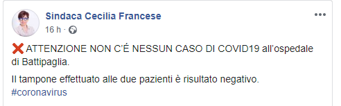 "ATTENZIONE NON C’É NESSUN CASO DI COVID19 all’ospedale di Battipaglia. Il tampone effettuato alle due pazienti è risultato negativo."