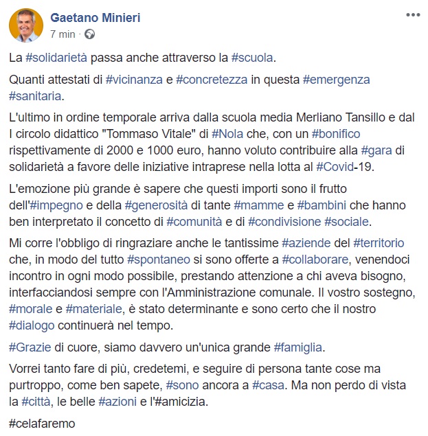 Questo quanto pubblicato sulla pagina facebook del Sindaco Minieri: