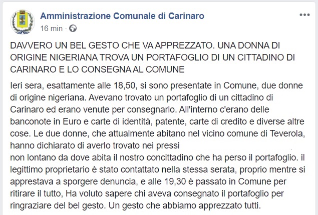 Questo quanto comunicato dalla pagina Facebook dell'Amministrazione del Comune di Carinaro