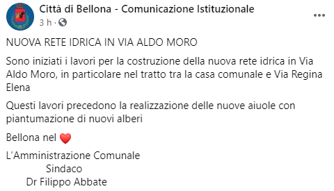 Questo il post pubblicato sulla pagina Facebook 'Città di Bellona': "Nuova rete idrica in Via Aldo Moro. Sono iniziati i lavori per la costruzione della nuova rete idrica in Via Aldo Moro, in particolare - si legge nel post - nel tratto tra la casa comunale e Via Regina Elena