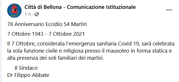 QUesto il post pubblicato sulla pagina Facebook della città di Bellona: "78 Anniversario Eccidio 54 Martiri. 7 Ottobre 1943 - 7 Ottobre 2021. Il 7 Ottobre, considerata l’emergenza sanitaria Covid 19 - si legge nel post - sarà celebrata la sola funzione civile e religiosa presso il mausoleo in forma statica e alla presenza dei soli familiari dei martiri. Il Sindaco Dr Filippo Abbate".